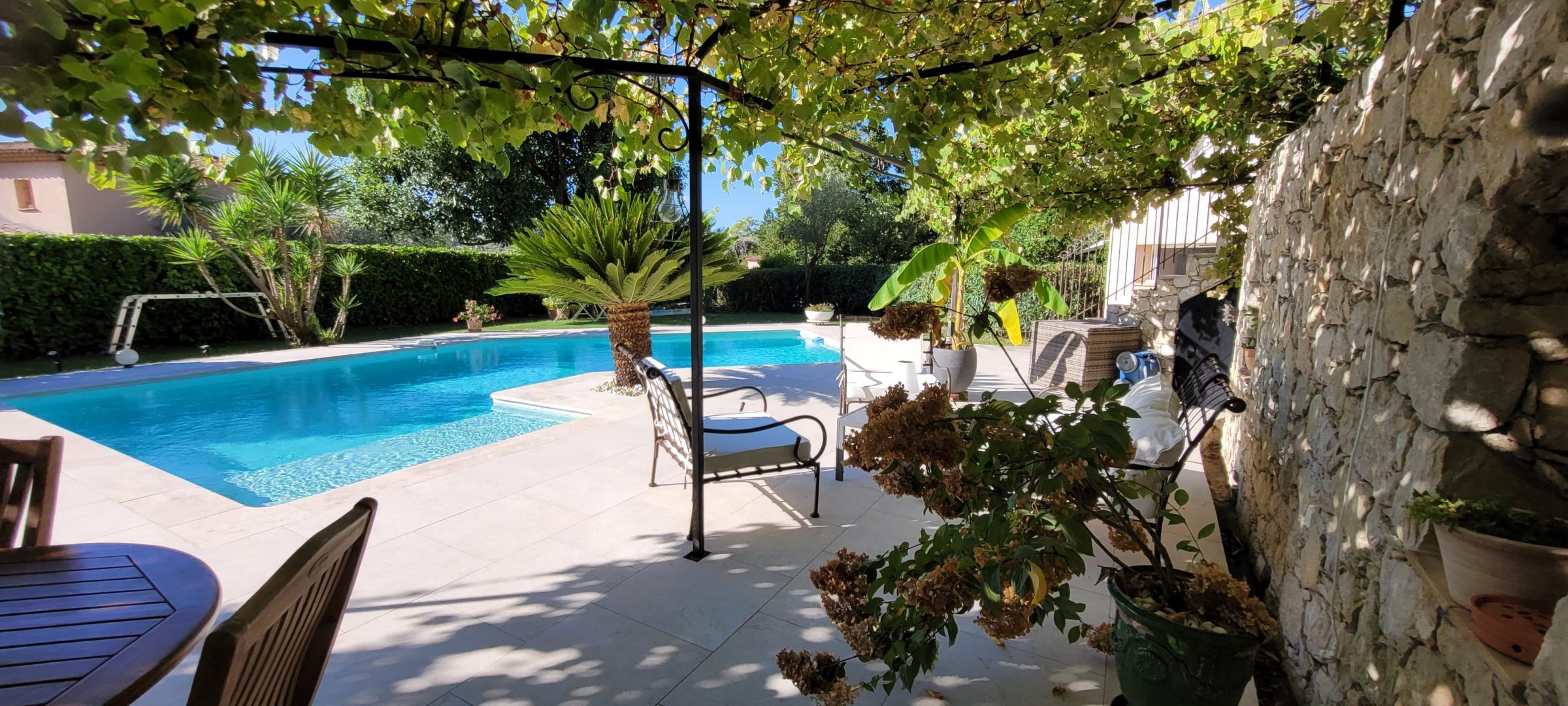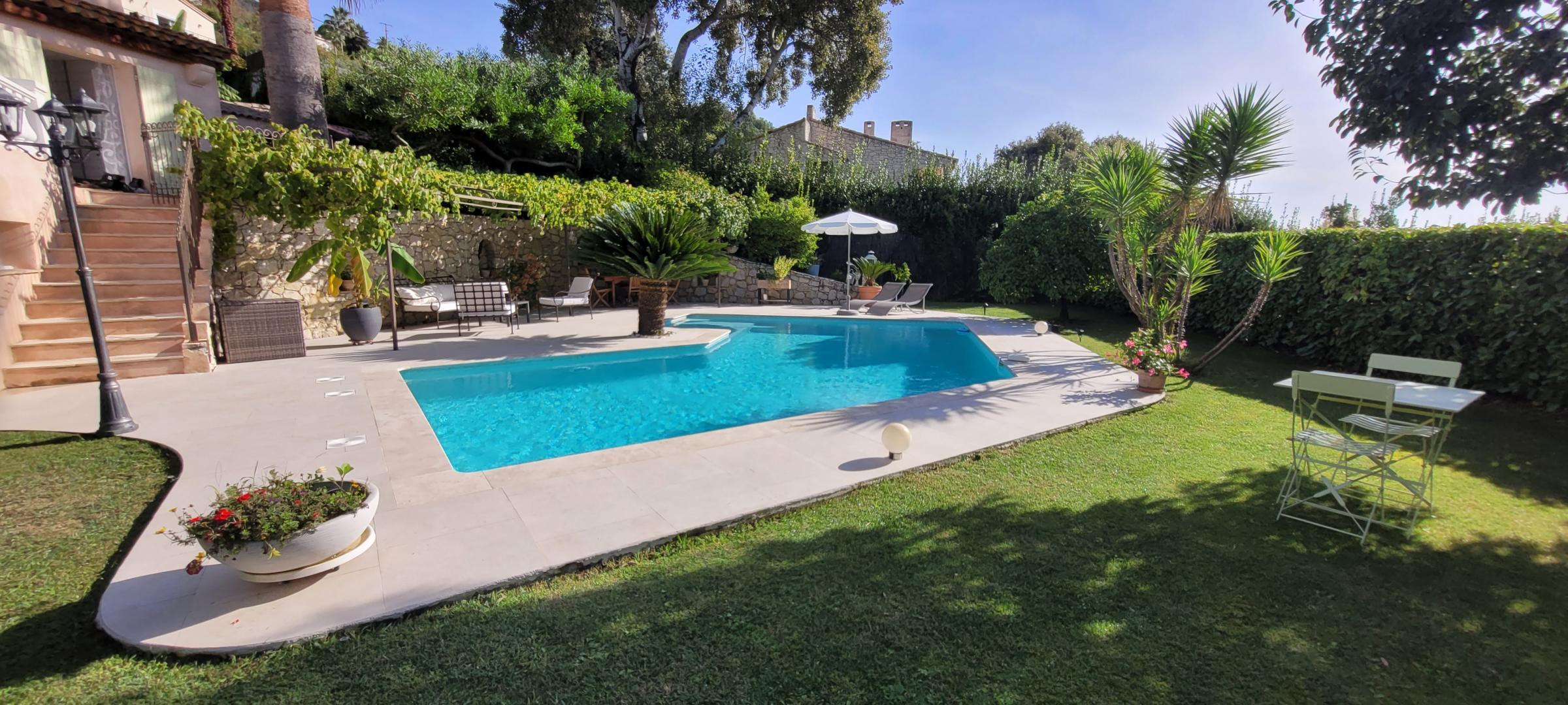 Rez de Chaussée de villa et sa grande piscine avec le Baou de Saint-Jeannet en toile de fond
