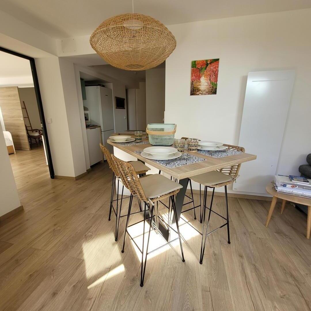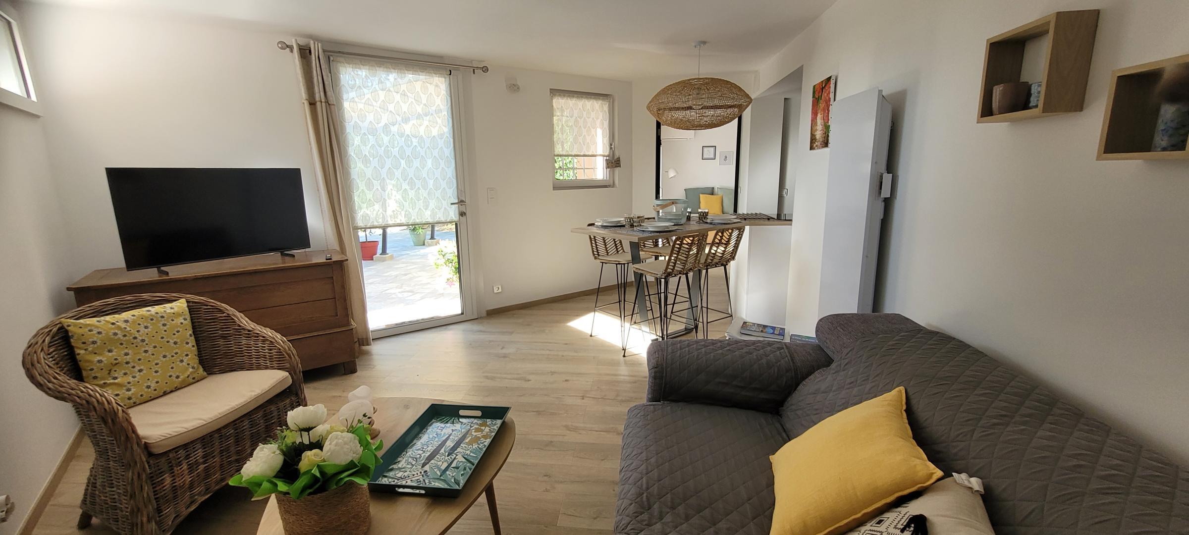 - Séjour avec table de salon, canapé et télévision. - Cuisine ouverte totalement équipée.