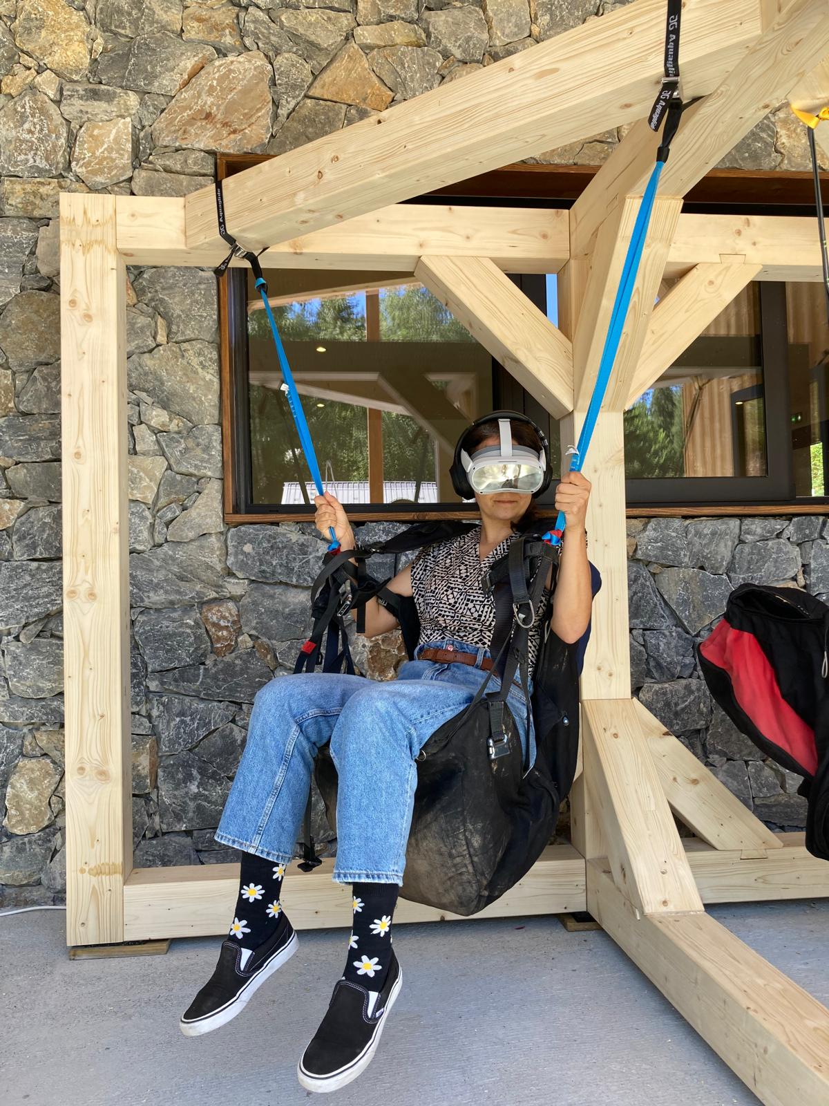Prenez de la hauteur sans quitter la station grâce au parapente virtuel, une expérience immersive qui permet de survoler la montagne en toute sécurité.
