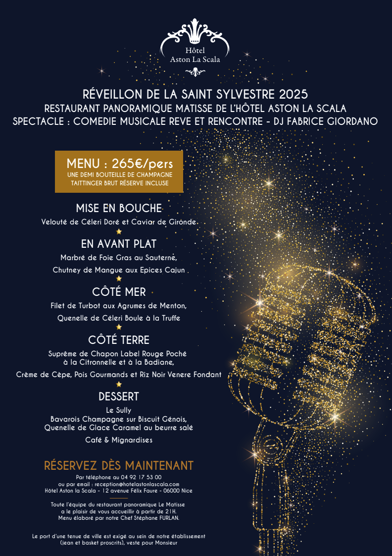 Réveillon de la Saint Sylvestre au restaurant panoramique Matisse de l'hôtel Aston La Scala. Repas spectacle : comédie musicale rêve et rencontre - DJ Fabrice Giordano.