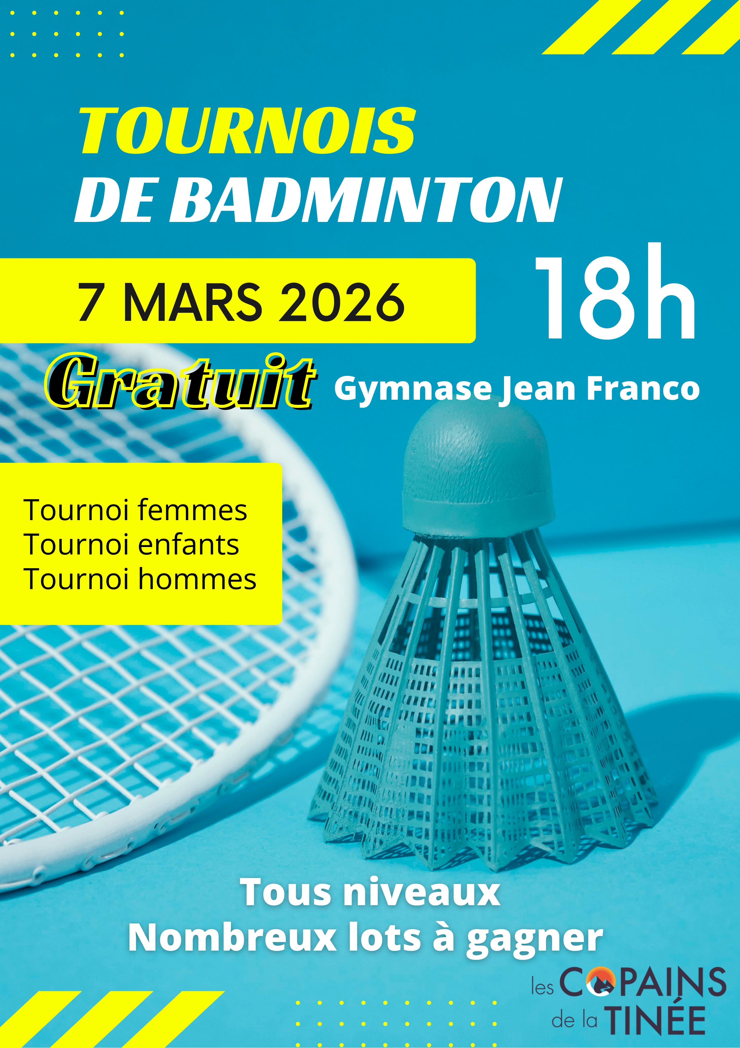 Tournois de badminton (femmes, hommes et enfants) organisés par l'Association Le Copains de la Tinée à partir de 18h.