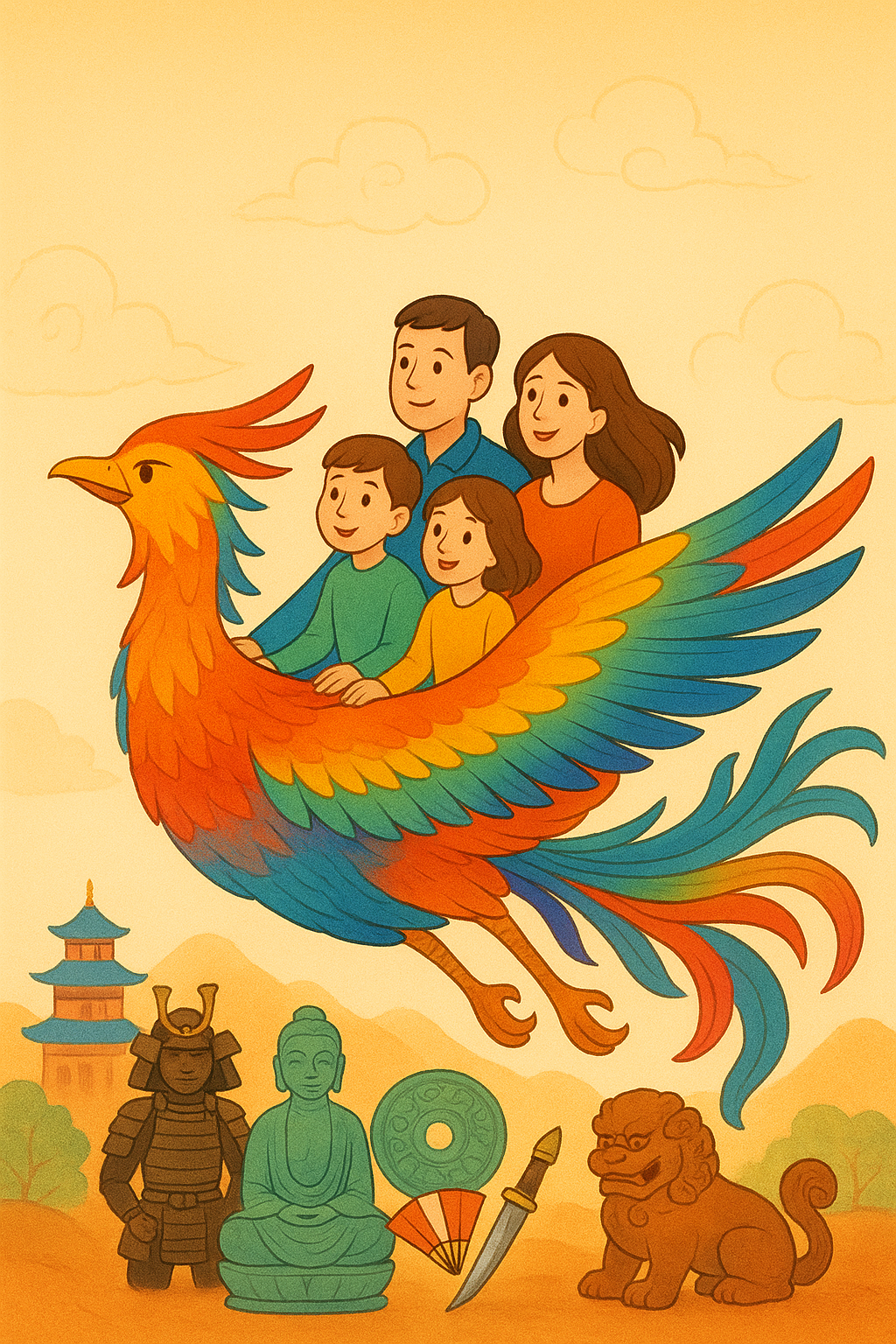 Venez découvrir l’Asie et certains de ses objets emblématiques à travers ce conte inédit. Le narrateur emmènera les enfants sur le dos d’un phénix à la découverte du Japon, de la Chine, de l’Asie du Sud-Est et de l’Inde !