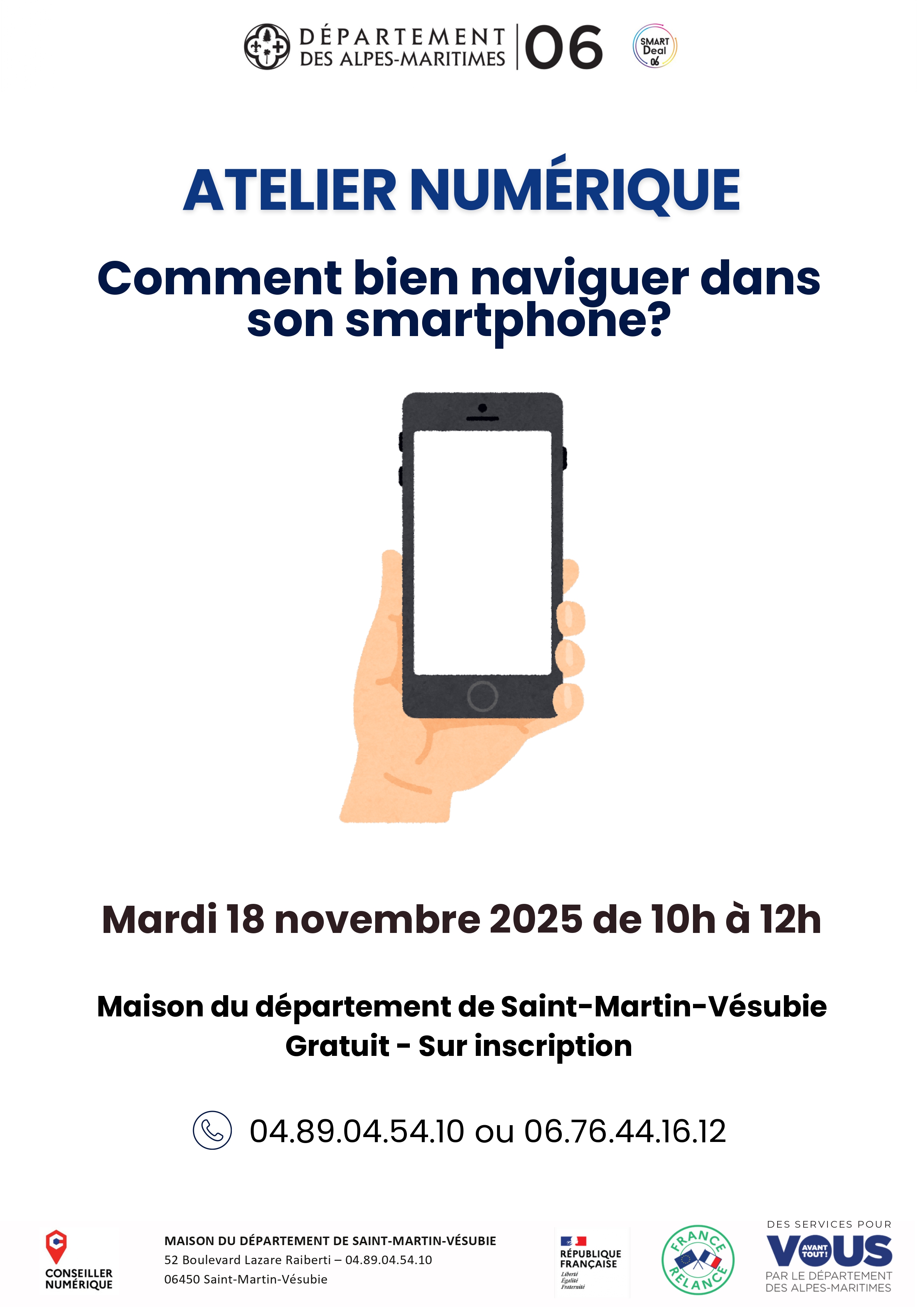 Un atelier sur la navigation avec le smartphone aura lieu mardi 18 novembre à 10h. Le second se déroulera mardi 16 décembre à 10h et sera consacré à la gestion des photos et des QR Codes sur le smartphone.
