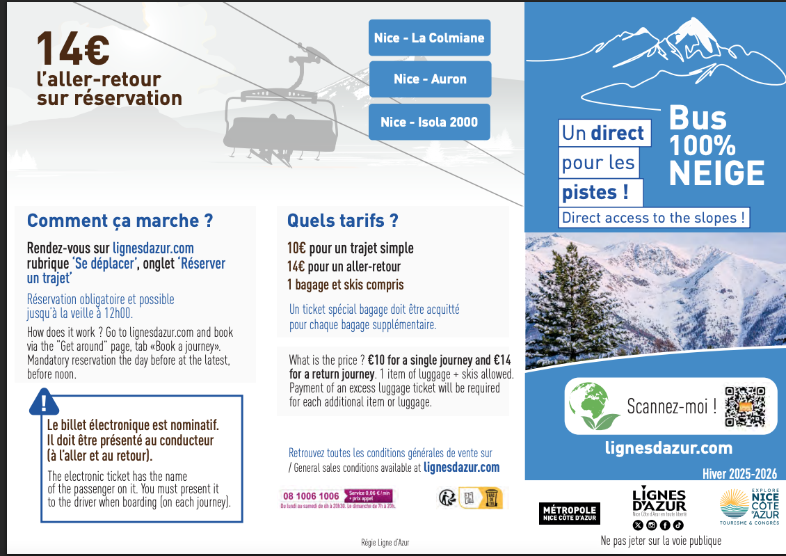 Tenuto conto del contesto sanitario, per motivi di flessibilità, le linee regolari della rete Lignes d'Azur 90 (Nizza Grand Arénas - Valdeblore La Bolline), 91 (Nizza Grand Arénas - Auron) e 92 (Nizza Grand Arénas - Isola 2000 Les Hameaux) senza prenotazione sono state rafforzate e restano alla tariffa generale senza costi aggiuntivi per il viaggiatore.