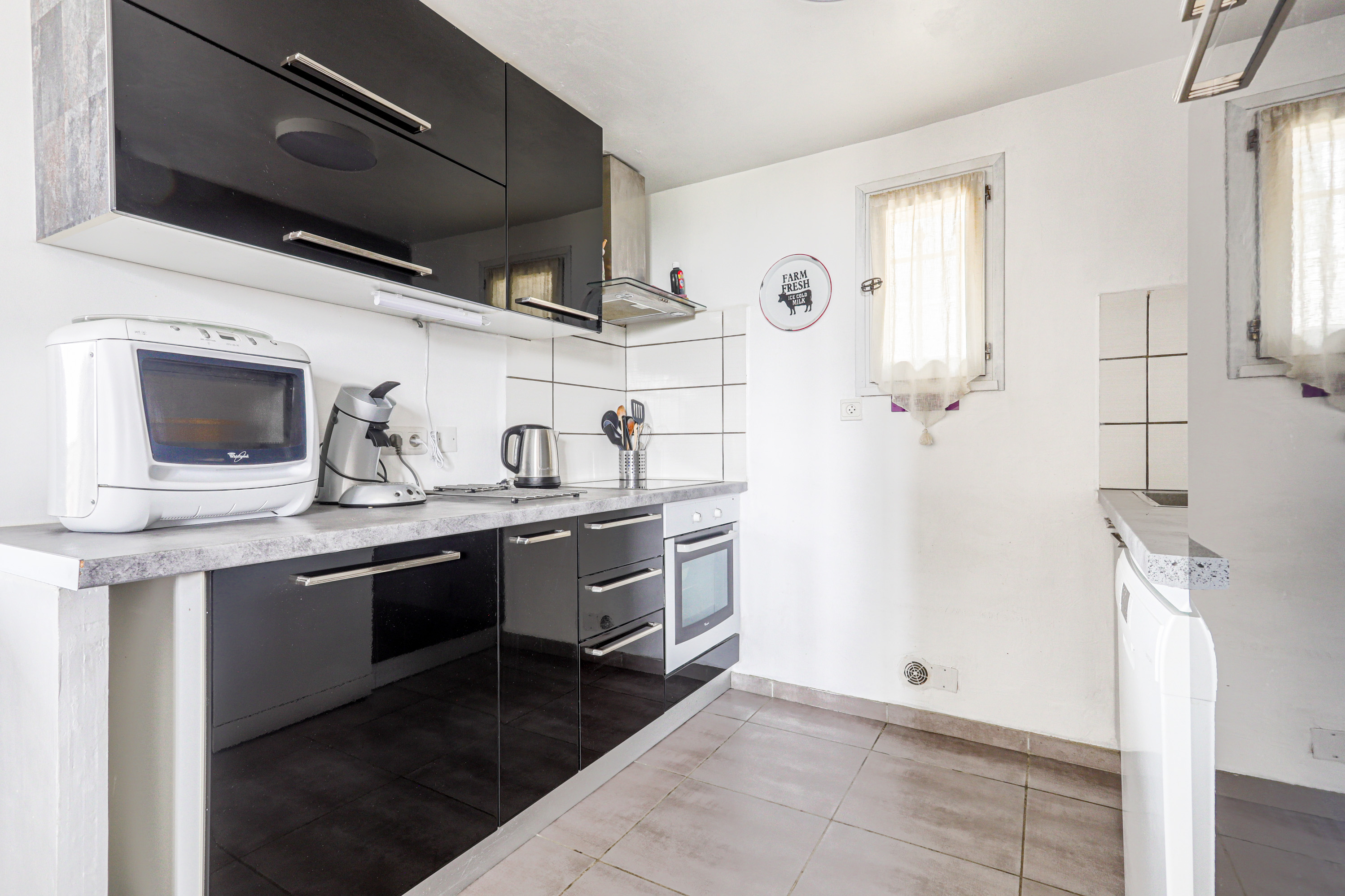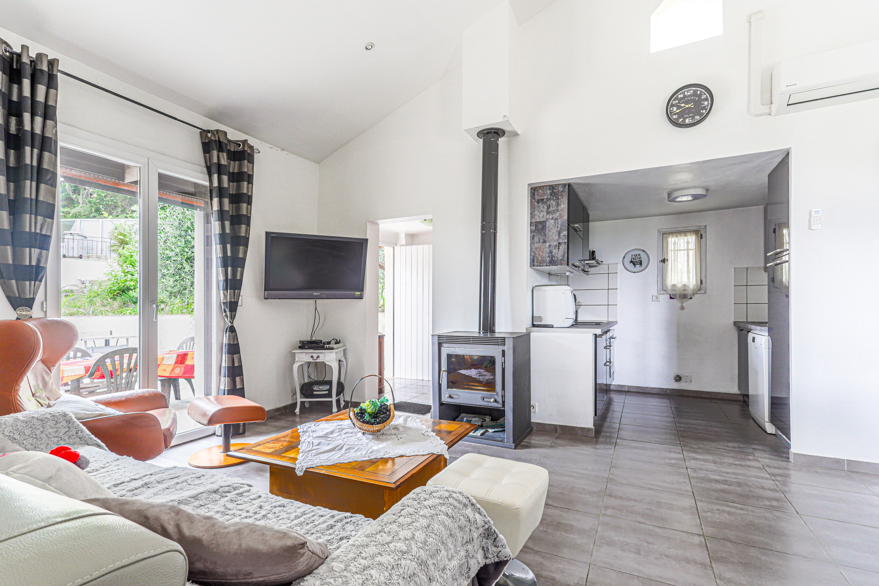 Ingresso indipendente tramite scale (20 gradini). Terrazze private pavimentate con vista mare (30 m² e 200 m²) con tende da sole. - Soggiorno con divano a 3 posti. Cucina a vista (forno, cappa aspirante, congelatore, ecc.). - 1 camera da letto (2 letti singoli 90 x 190 cm). - 1 camera da letto (2 letti singoli elettrici unibili a formare un letto king-size), terrazza adiacente tramite 2 gradini (barbecue). - Bagno con ampia doccia angolare da 90 cm e WC. - Disponibili: libri, giochi da tavolo. Parcheggio privato per 1 auto. Energia (elettricità per aria condizionata e riscaldamento: 0,27 €/kWh extra, a vostro carico. Lenzuola e asciugamani: non inclusi). Attrezzature per bambini disponibili su richiesta. Verrà addebitato un supplemento di 80 € a soggiorno per le pulizie, in aggiunta al prezzo di affitto, poiché troppe persone dimenticano di pulire i locali alla partenza. Prezzo tra 850 € e 1000 € a seconda della stagione.