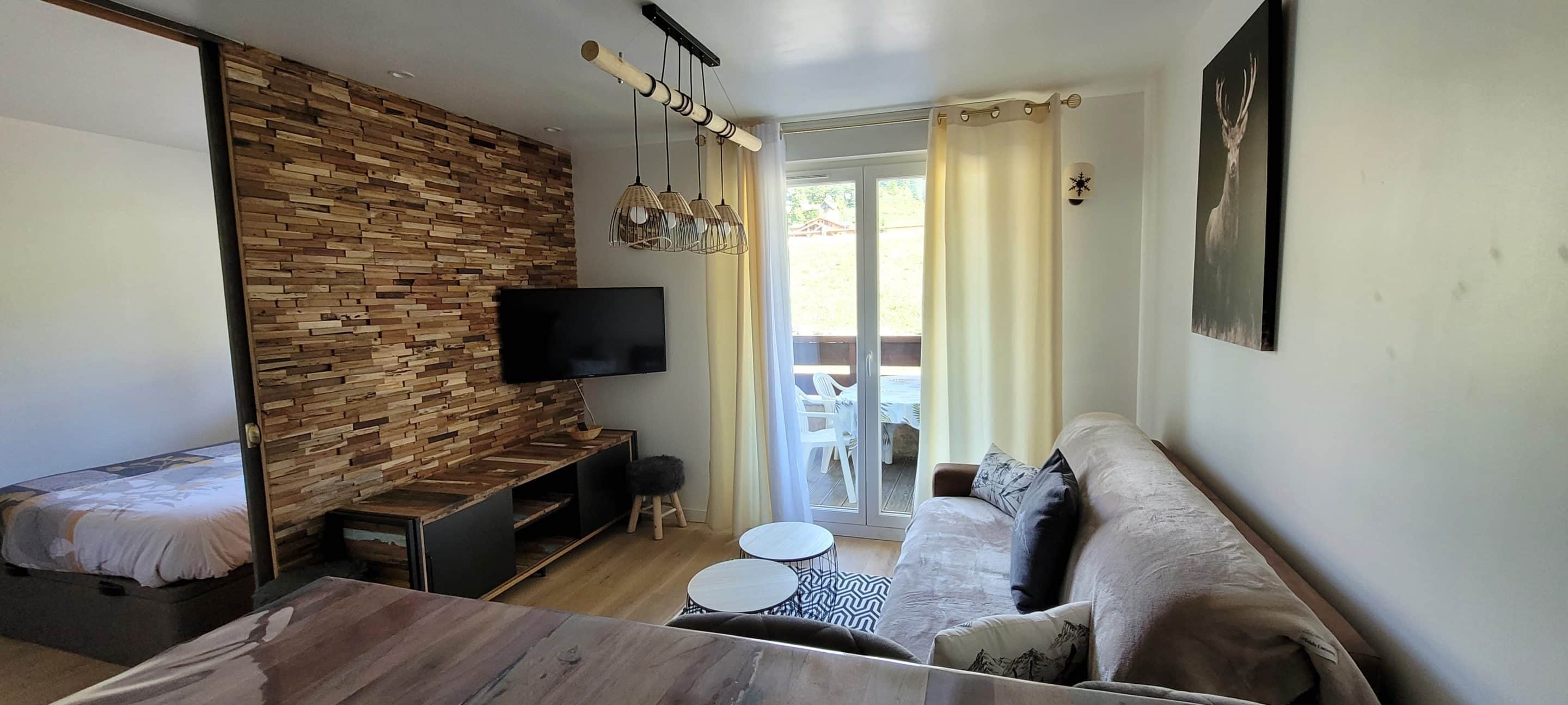 Un coin salon avec un canapé lit 2 places et un écran plat