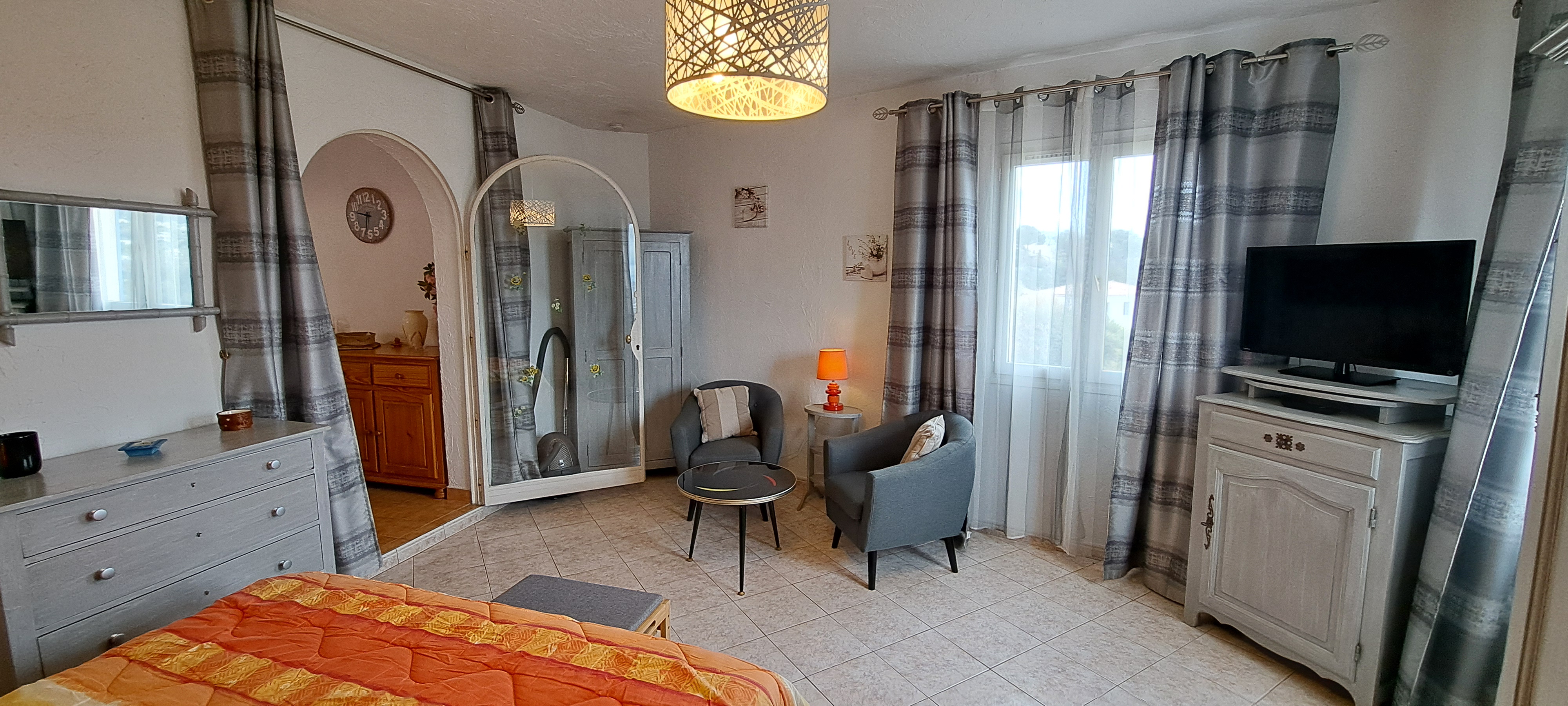 une grande chambre avec un lit 2 places (160x200) 2 chevets et 2 fauteuils, une table basse, une commode,une armoire