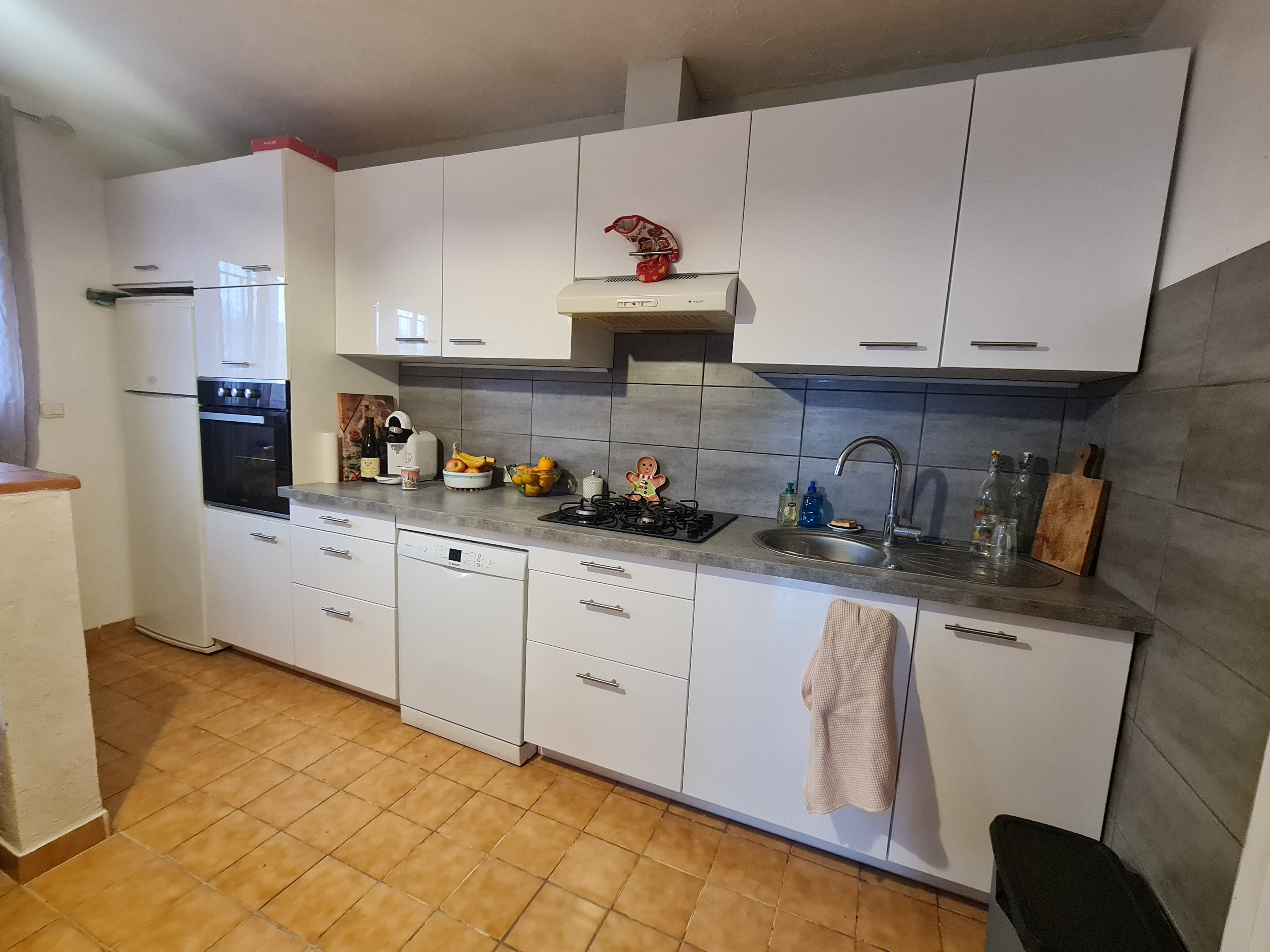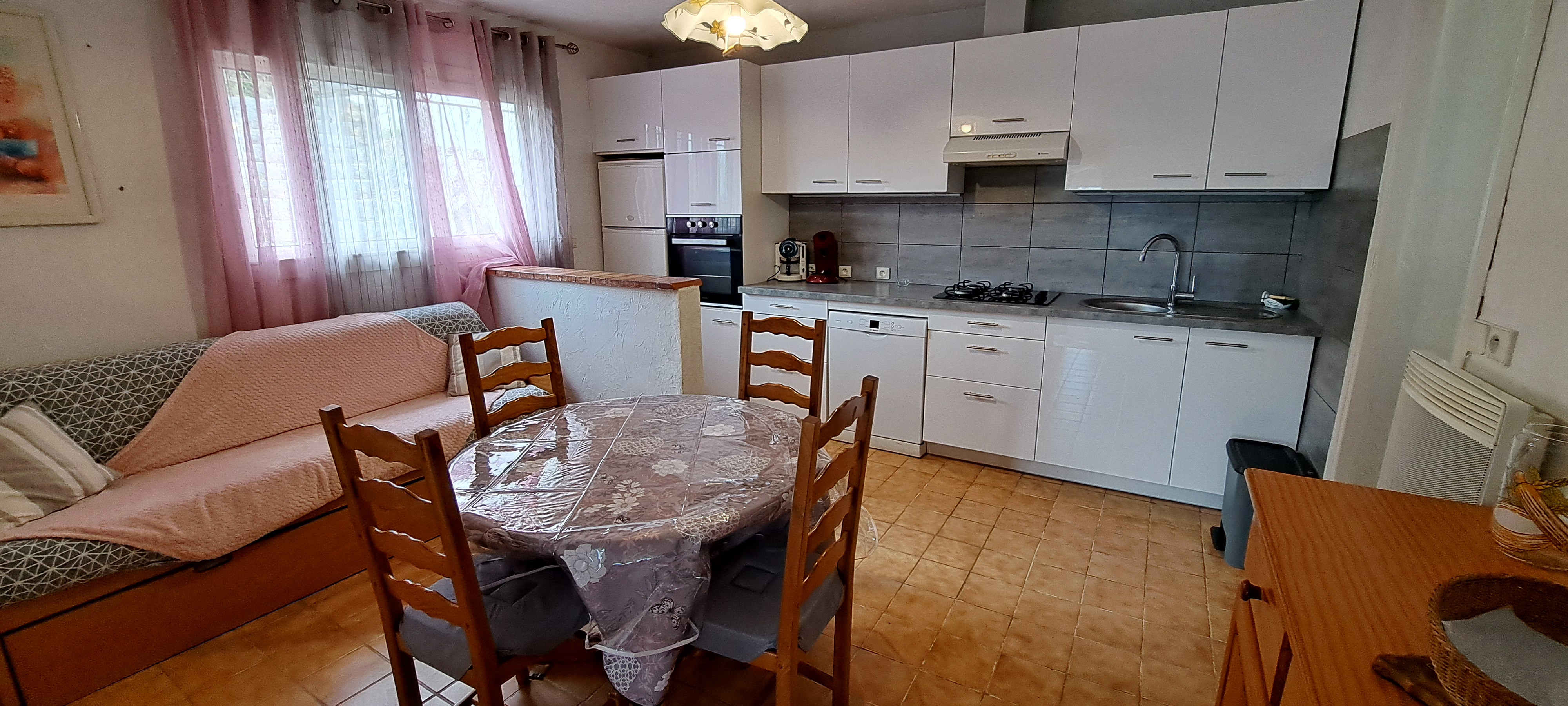 cuisine ouverte sur coin repas, toute équipée, avec four, plaque 4 feux gaz, lave vaisselle et réfrigérateur-congélateur