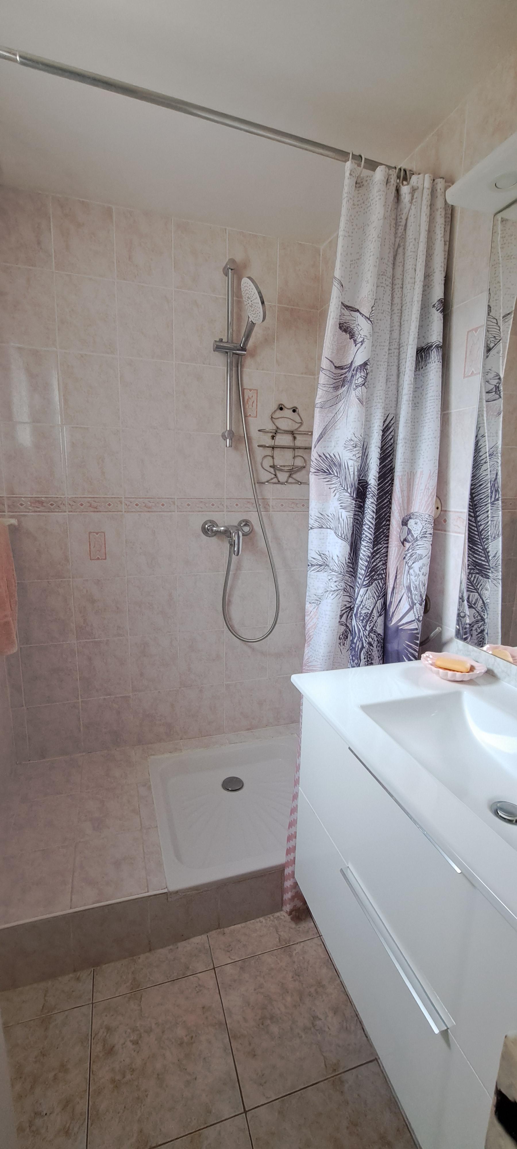 une entrée, salle de bain avec douche et meuble vasque. wc séparé