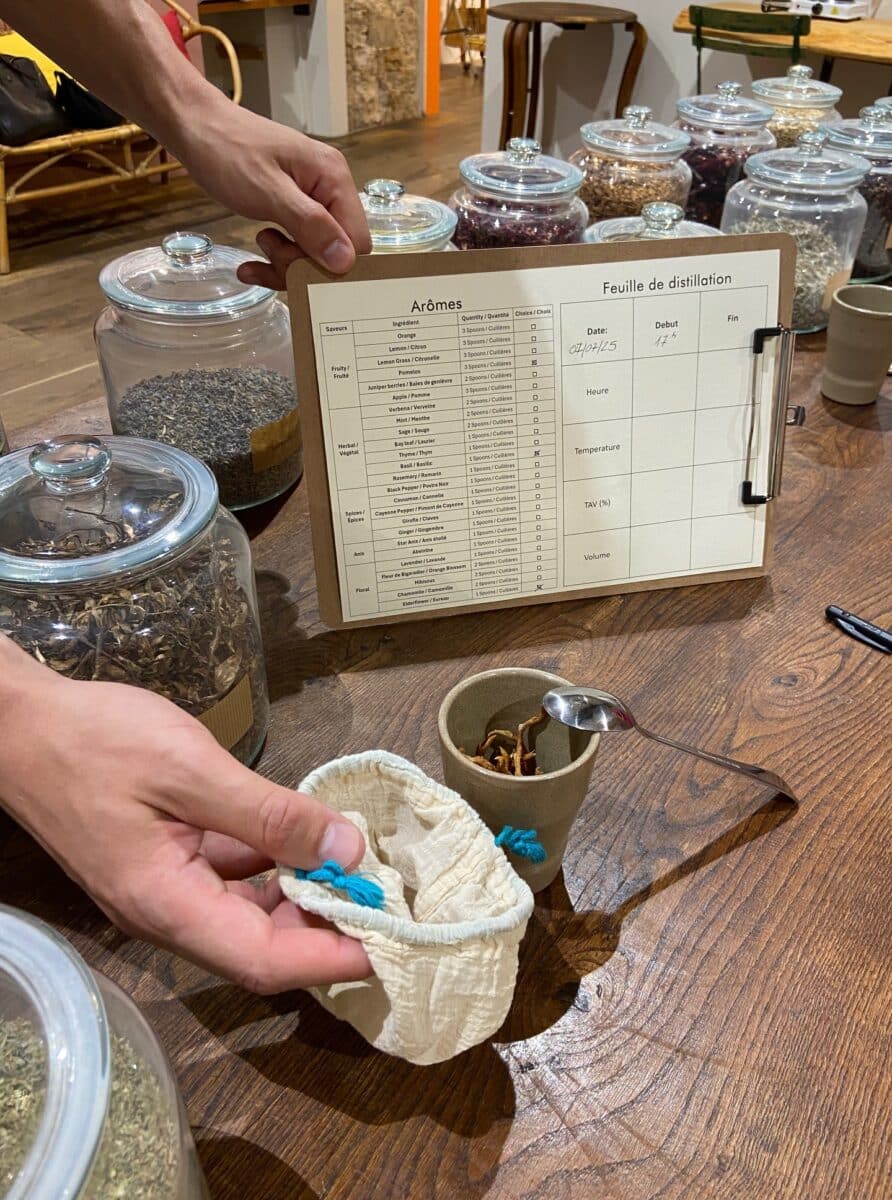 Un po’ come una “professionista”, ho selezionato una combinazione di erbe e frutti per rendere il mio gin unico, seguendo le proporzioni consigliate da Théo. Poi ho messo tutto nel cestello dell’alambicco per avviare la distillazione…