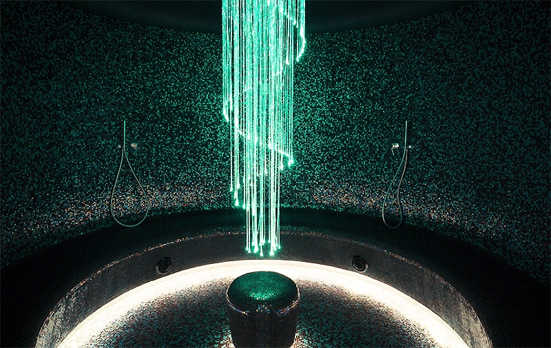 - le Hammam traditionnel (40-45°/98% humidité), un véritable cocon de vapeur avec sa cascade de lumière verte faisant penser aux aurores boréales… Un lâcher prise total !