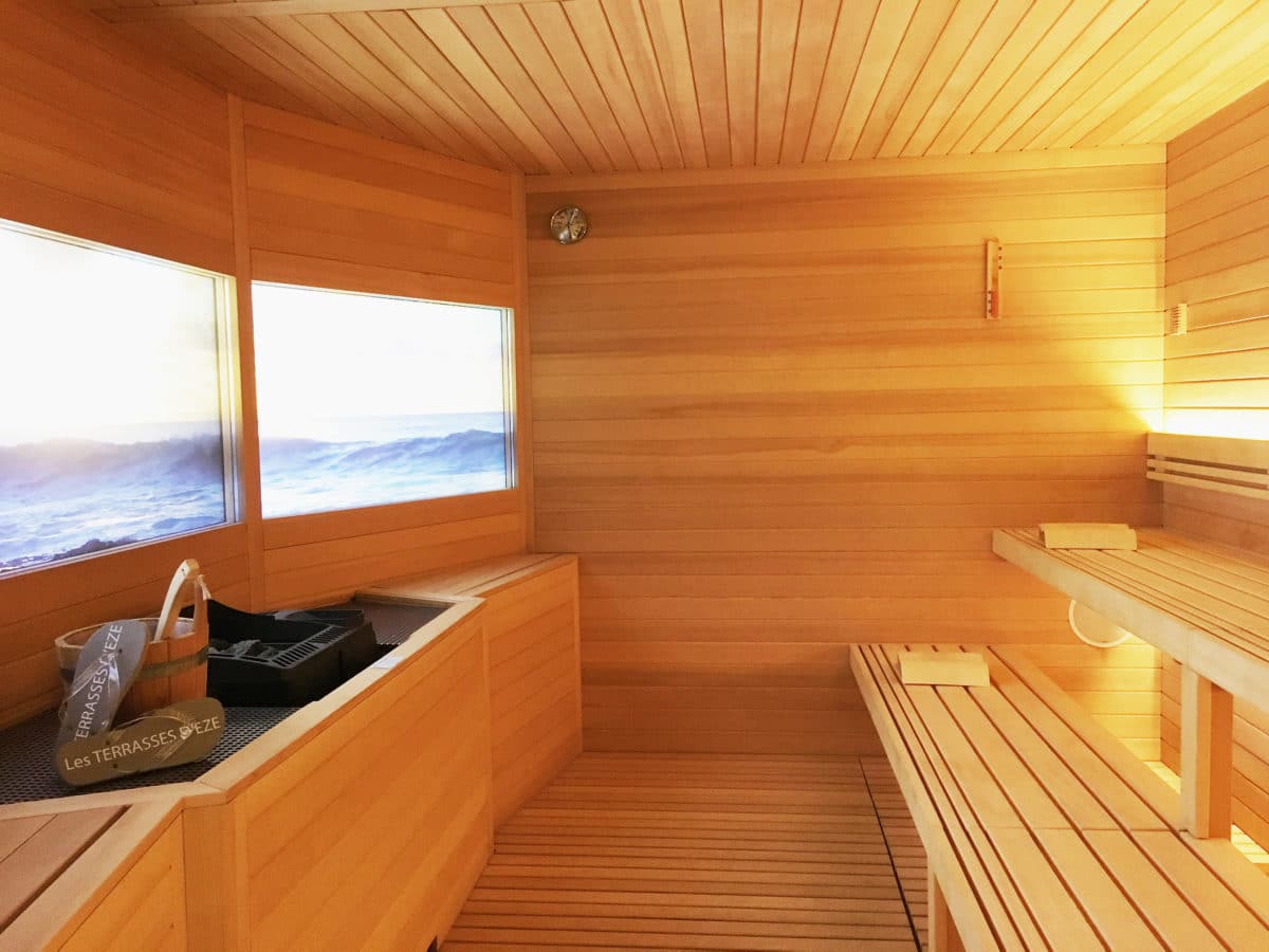 - Par ailleurs, le Bio-Sauna (60°/40% humidité), tout de bois vêtu, équipé de 3 écrans plats. Ceux-ci diffusent une vidéo sur la mer et par 2 enceintes, je peux entendre le roulis des vagues mourant sur le sable, c’est vraiment bluffant. Je ferme maintenant les yeux et me voilà allongée sur une plage à l’autre bout du monde… Une innovation technologique unique au SPA des « Terrasses d’Eze » !